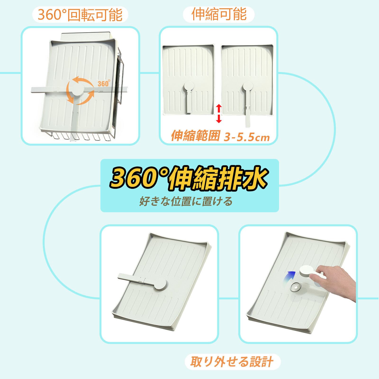 【自動排水機能】 排水口に取り付けられた水はけがあり、たまった水を自動的にシンクに排水します。水はけは360度回転し、伸縮可能なので、シンクのサイズや配置に合わせて調節できます。これにより、受け皿に溜まった水を手動で捨てる手間が省け、清潔で整然とした状態を維持できます。見た目の美しさと実用性を兼ね備えた優れた水切りラックです。工具が不要なため、数秒で簡単に設置できます。 【創新カトラリーポケット】 創新カトラリーポケットは底部が取り外せるので、お手入れが簡単です。また、三つ分け(仕切り)によって、スプーン、箸、フォークなどをしっかり分類して収納できます。