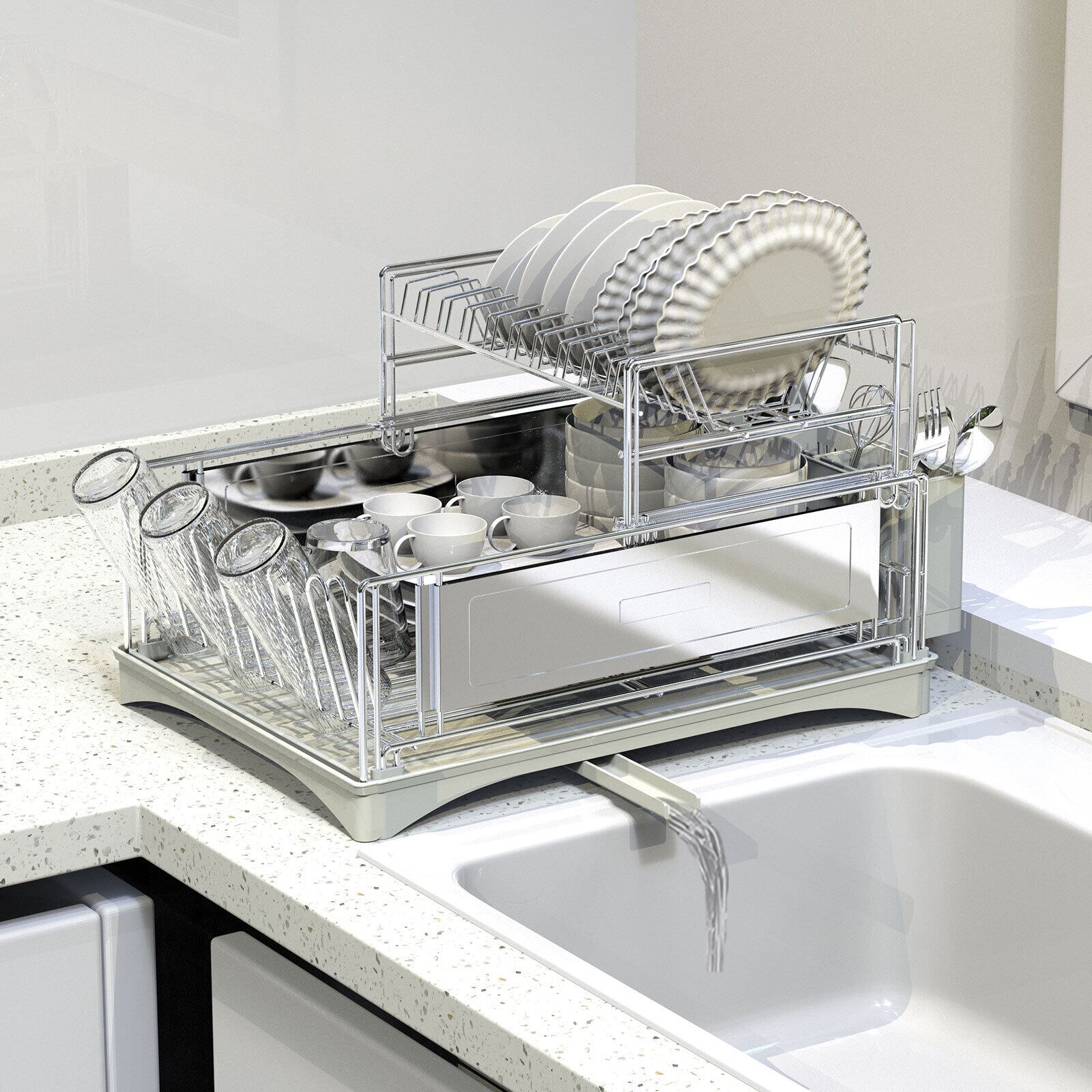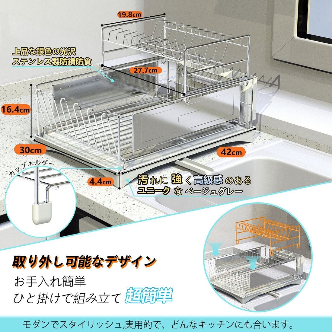 食器 水切りラック 2段 食器 水切りかご 食器乾燥 収納 D30*W42*H27 省スペース グラススタンド 大容量 ステンレス鋼 汚れに強い 錆に強い 組み立て簡単 ベージュグレー